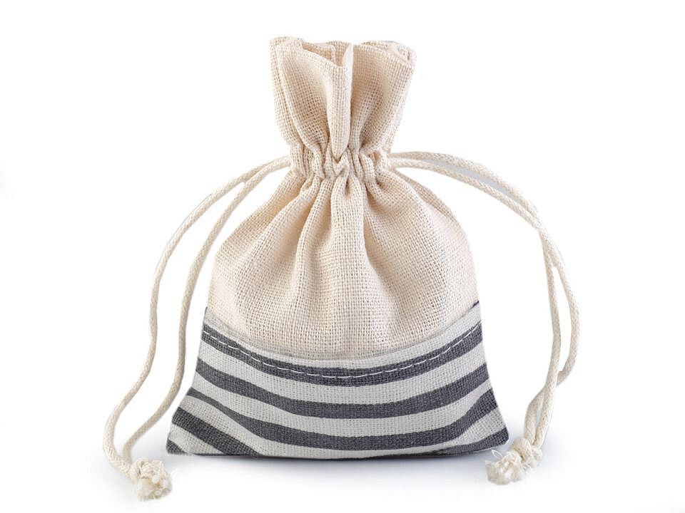Lněný pytlík v námořnickém stylu zdobí vodorovné proužky. Uzavírá se pomocí dvou stahovacích šňůrek. Pytlík využijete k balení menších dárků. Můžete do něj také vložit sušené bylinky, které budou krásně vonět.