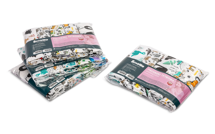 Pieluszki są konfekcjonowane w zestawy po 5 szt. Wzory w zestawach są dobierane losowo według dostępności materiałów. Natomiast zawsze zostaje zachowany podział na zestawy dedykowane chłopakom i dziewczynkom.
