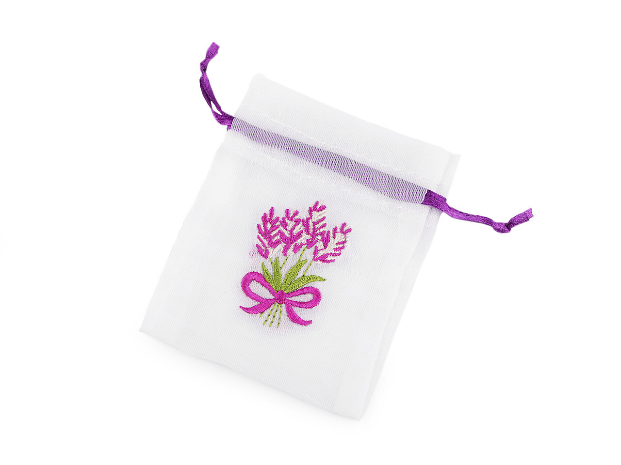 Malý dárkový pytlík je průsvitný. Je ozdobený milou výšivkou květů levandule. Snadno se uzavírá pomocí dvou stahovacích saténových šňůrek. Pytlík působí luxusně, můžete do něj zabalit drobné dárky, uschovat vaše osobní poklady nebo naaranžovat voňavé sušené květy.