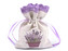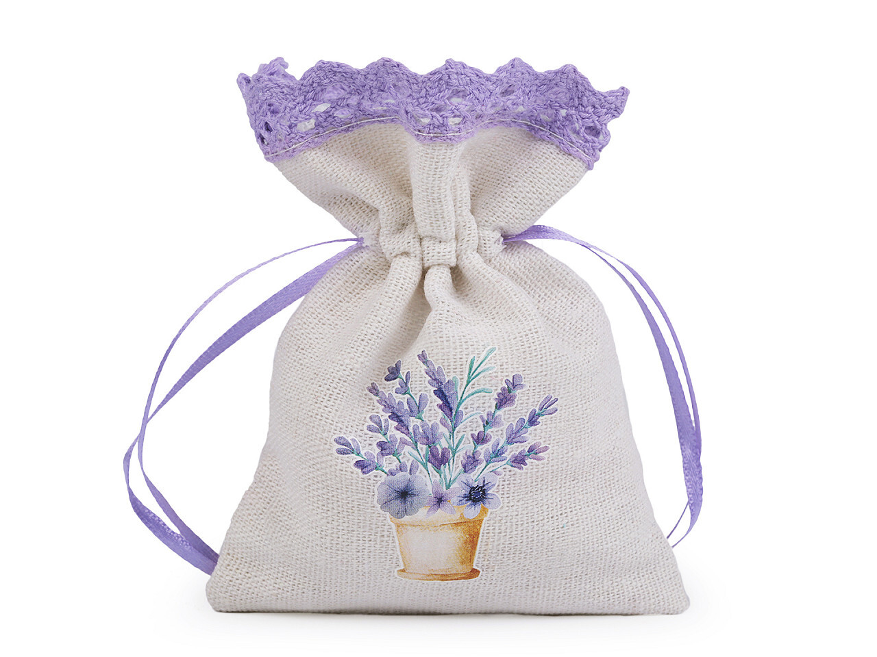 Plátěný dárkový pytlík je ozdobený potiskem květů levandule. Plátno má hrubší strukturu, která působí jako imitace juty. Nahoře je olemovaný paličkovanou krajkou. Snadno se uzavírá pomocí dvou stahovacích saténových šňůrek.