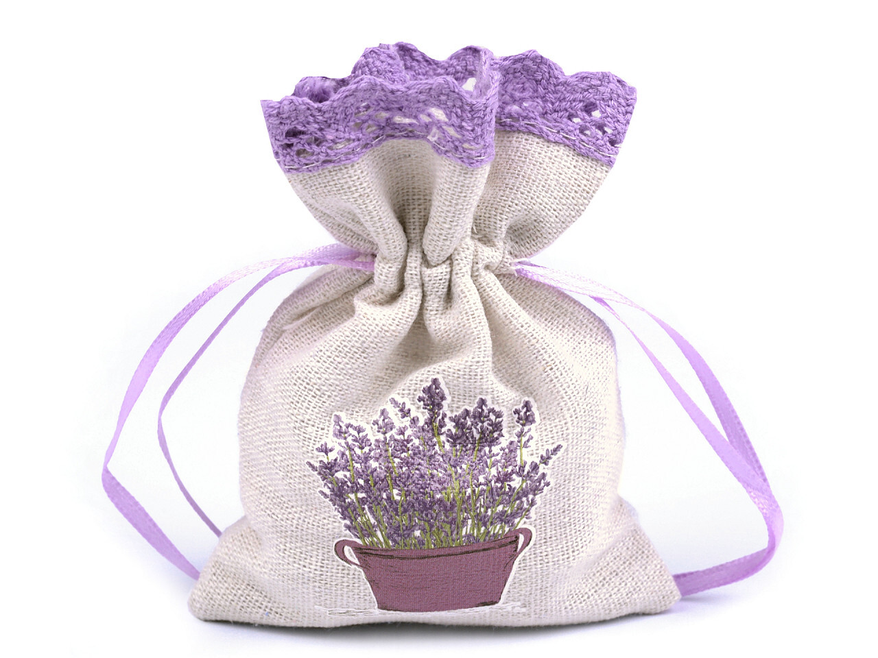 Plátěný dárkový pytlík o rozměru 9x12 cm je zdobený něžným potiskem květů levandule, který navozuje atmosféru klidu a pohody. Materiál má hrubší texturu, která věrně imituje přírodní jutové vlákno, což pytlíku dodává rustikální, ale zároveň luxusní vzhled. Vrchní okraj pytlíku je elegantně olemován paličkovanou krajkou pro dokonalý detail. Zavírání usnadňují dva stahovací saténové šňůrky, které nejen prakticky slouží, ale i krásně doplňují celkový vzhled.
