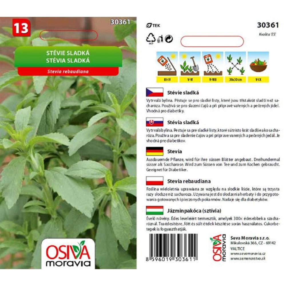 - Drobná semena stévie vyséváme v březnu a dubnu na povrch výsevního substrátu a jenom lehounce zasypeme tenkou vrstvičkou kompostu nebo agroperlitu. Dáme na světlé místo a udržujeme stálou teplotu nad 20 °C. Když jsou semenáčky dost velké k uchopení, přesadíme je do květináčků. Zpočátku rostou pomalu, na předpěstování rostlin musíme počítat s dobou nejméně 6 týdnů.