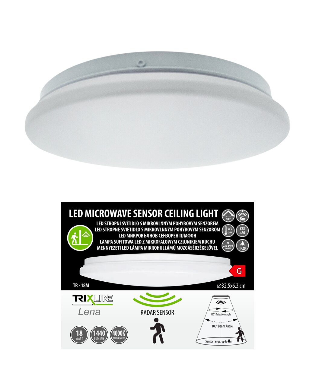 Trixline LED stropní svítidlo 18W LENA TR-18M s mikrovlnným pohybovým senzorem. Po zaznamenání pohybu svítí 30s.