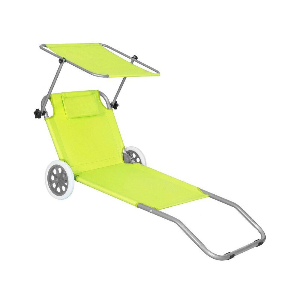Mobilní plážové lehátko s nastavitelným sklonem opěradla a stříšky. Ve výbavě nechybí komfortní doplňky jako jsou pojezdová kolečka, polstrovaný podhlavník, madlo na uchycení nebo vestavěná síťovaná taška.