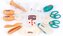 obsahuje 29ks příslušenství - vozík na příslušenství s policemi, rentgenový panel s osvětlením, vyměnitelné šablony se snímky plic, páteře, ruky a také EKG, stetoskop, kapačka, kyslíková maska s lahví a další doplňky,