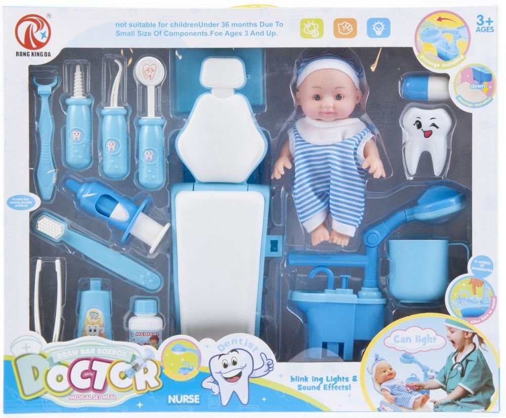 skutečně fungující zubní lampu s přepínacím tlačítkem, vodovodní baterie opravdu funguje ! Stačí stisknout tlačítko!. Děti sní o tom, že se v budoucnu stanou lékařem. Nechte ho tedy připravit se na svou vysněnou práci hned teď! Obsah sady: dětská panenka, zubařské křeslo, nástroje zubního lékaře: stříkačka, zubní kartáček, zubní pasta, tableta, kleště, hrnek, zub. Rozměry / ??hmotnost / baterie: velikost balení (délka x výška x hloubka) [cm]: 50x41x10, hmotnost produktu v balení [kg]: 0,98 kg, vyžaduje 2 x baterie AG10 - jsou součástí sady. Výrobek je určen pro děti od 3 let. Baleno v krabici s oknem