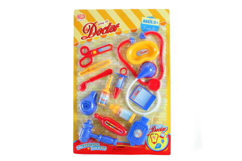 Plastová sada na kartě pro malého doktora nebo doktorku. Obsahuje vše potřebné - stetoskop, kladívko, teploměr, injekci, pinzetu, nůžky a spoustu dalšího náčiní. Celkem 13 ks. Rozměry balení cca 28 x 43 cm. Věk 3+ číst celé