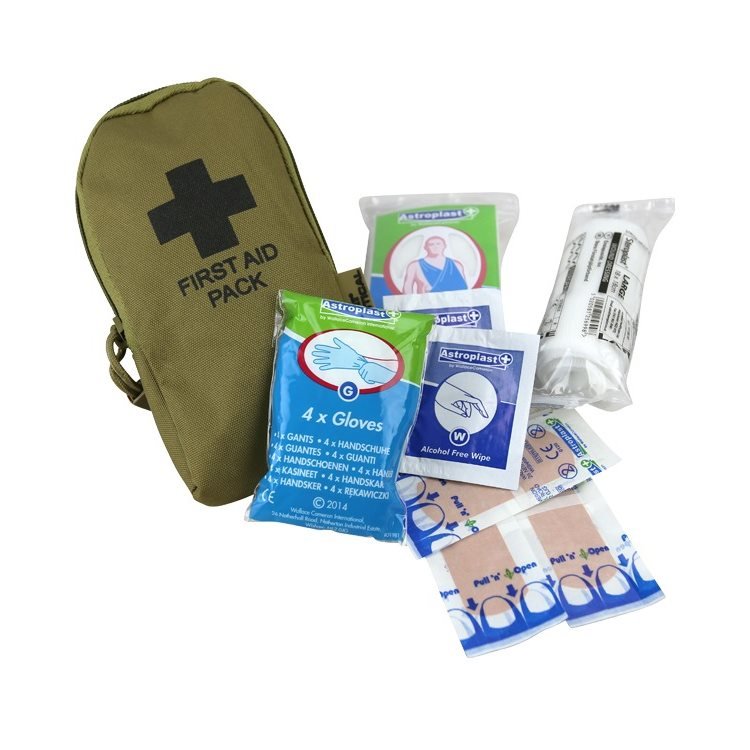 Malá kompaktní osobní lékárnička v maskovacím potisku. Lékárnička má vzadu dva elastické průvleky pro přichycení na výstroj apod. Velikost lékárničky 20 x 10 x 2,5 cm.