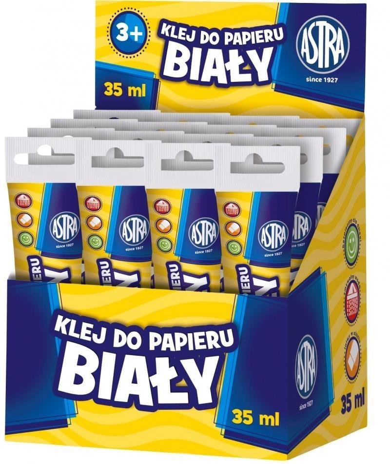 Klej w tubach ASTRY jest klejem o konsystencji pasty. Nadaje się przede wszystkim do klejenia papieru i cienkiej tektury. Jest łatwo zmywalny i nie pozostawia zabrudzeń.Opakowanie zbiorcze zawiera 16 sztuk. číst celé