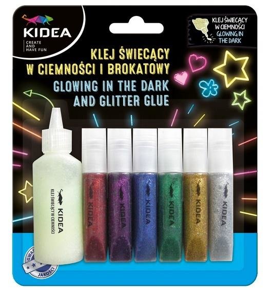 Zestaw zawiera niezwykły klej brokatowy świecący w ciemności oraz 6 fantastycznych brokatów w zachwycających kolorach (czerwony, fioletowy, niebieski, zielony, złoty i srebrny). Dzięki brokatowemu kolorowi święcącemu w ciemności twórczość dziecka osiągnie oryginalny i spektakularny efekt. Kleje brokatowe idealnie sprawdzą się w dekorowaniu papieru, ozdób świątecznych oraz kartek okolicznościowych. Duża zawartości brokatu zapewnia intensywny, mieniący efekt. Ergonomiczne opakowanie pozwala w łatwy sposób nałożyć klej w wybrane miejsca i tym samym stworzyć precyzyjne wzory