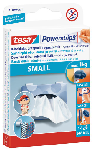 Usnadněte si upevňování drobných předmětů bez vrtání a nepořádku! Lepicí proužky tesa Powerstrips Small jsou ideálním řešením, jak rychle a pevně připevnit dekorace, kabely či jiné malé ploché věci na hladké povrchy.