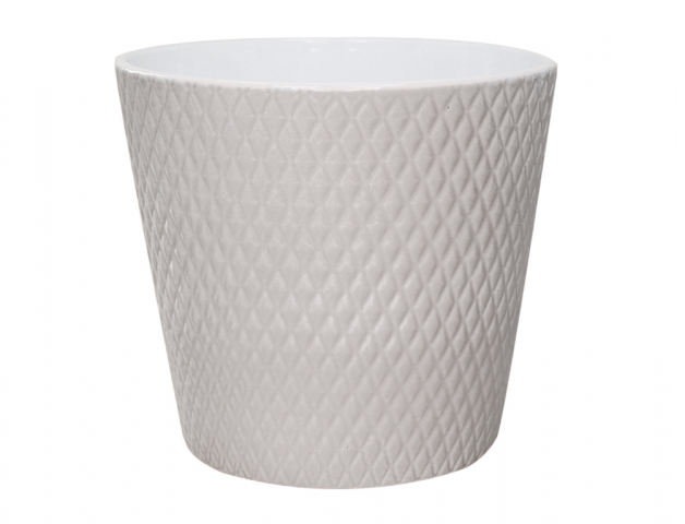Keremický lehce kónický lesklý obal vhodný pro květináče s rostlinami a pro jiné dekorace. Elegantní desing spočívá v jemných kosočtvercích. Barva: šedá. Průměr: 15 cm, výška: 13 cm. číst celé