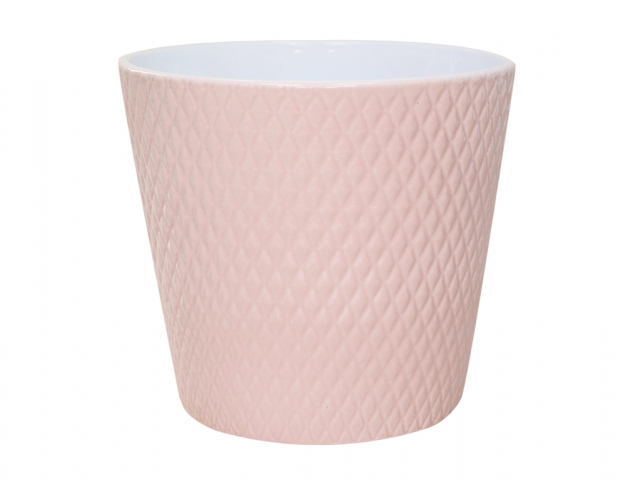 Keremický lehce kónický lesklý obal vhodný pro květináče s rostlinami a pro jiné dekorace. Elegantní desing spočívá v jemných kosočtvercích. Barva: růžová. Průměr: 15 cm, výška: 13 cm. číst celé