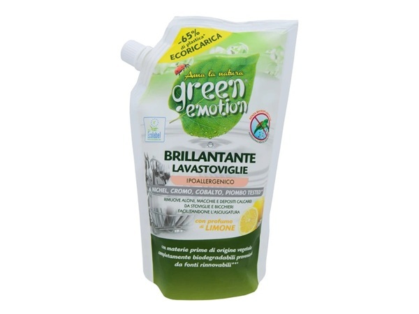Green Emotion Brillantante hypoalergenní leštidlo do myčky náplň 500 ml. Ekologickéleštidlo do myčky. Odstraňuje skvrny a usazeniny vodního kamene z nádobí a sklenic a usnadňuje sušení. Zabraňuje tvorbě šmouh při sušení nádobí, talířů a sklenic, díky čemuž jsou lesklé a třpytivé. S esenciálním citrónovým olejem. Vhodné pro ČOV = čističky odpadních vod.