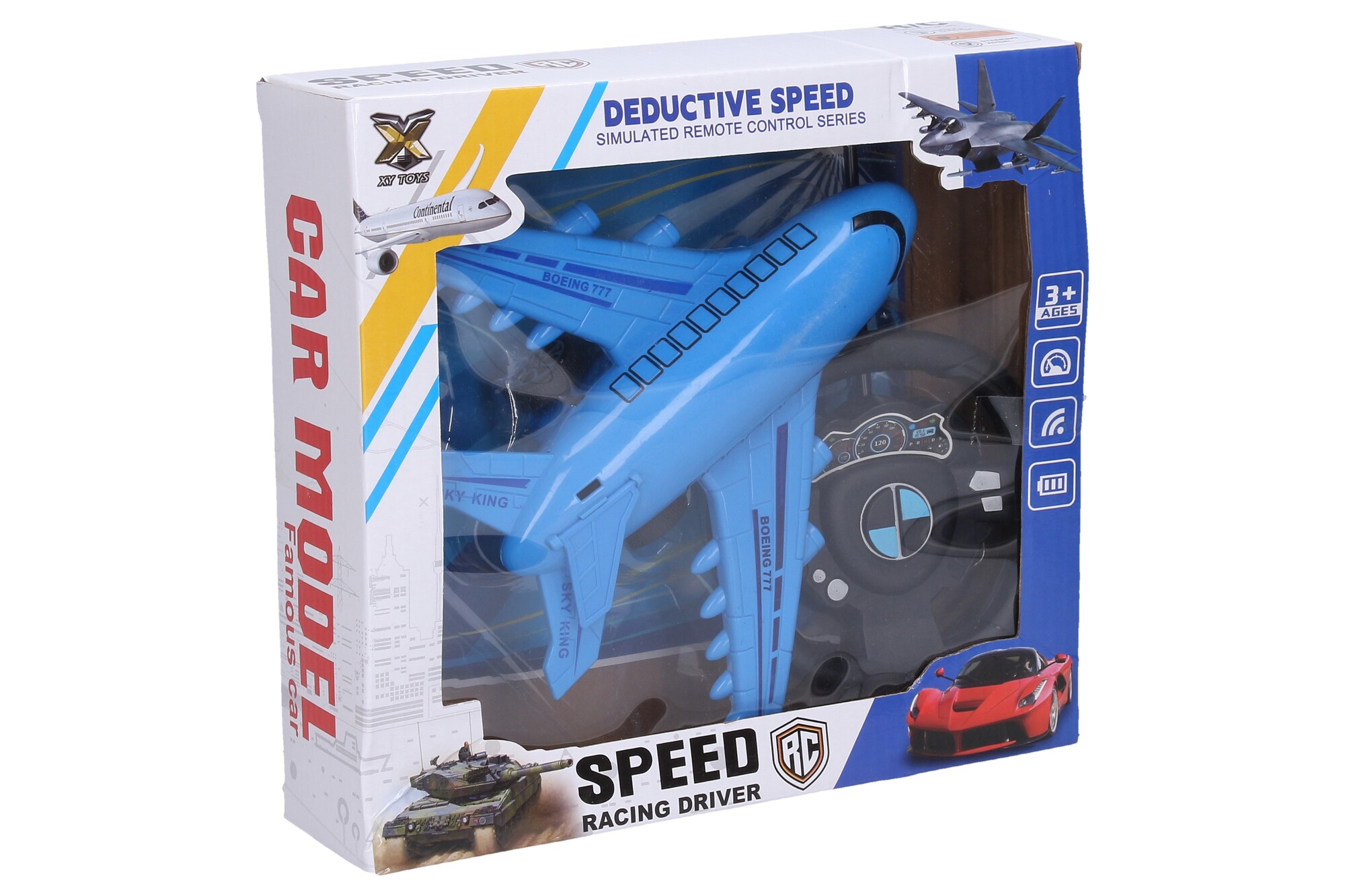 Letadlo jezdící RC na dálkové ovládání. Rozměry 18x21 cm. 3xAAA do letadla, 2xAA do ovladače nejsou součástí. Přepínač ON/OFF na spodní straně letadla. Ovladač - 2 tlačítka uprostřed volantu - jezdí jen dopředu, dozadu, nezatáčí.