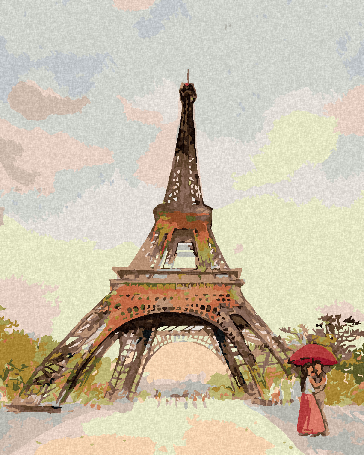 Malování podle čísel - EIFFELOVA VĚŽ A ŽENA S ČERVENÝM DEŠTNÍKEM - 80x100 cm, bez rámu a bez vypnutí plátna