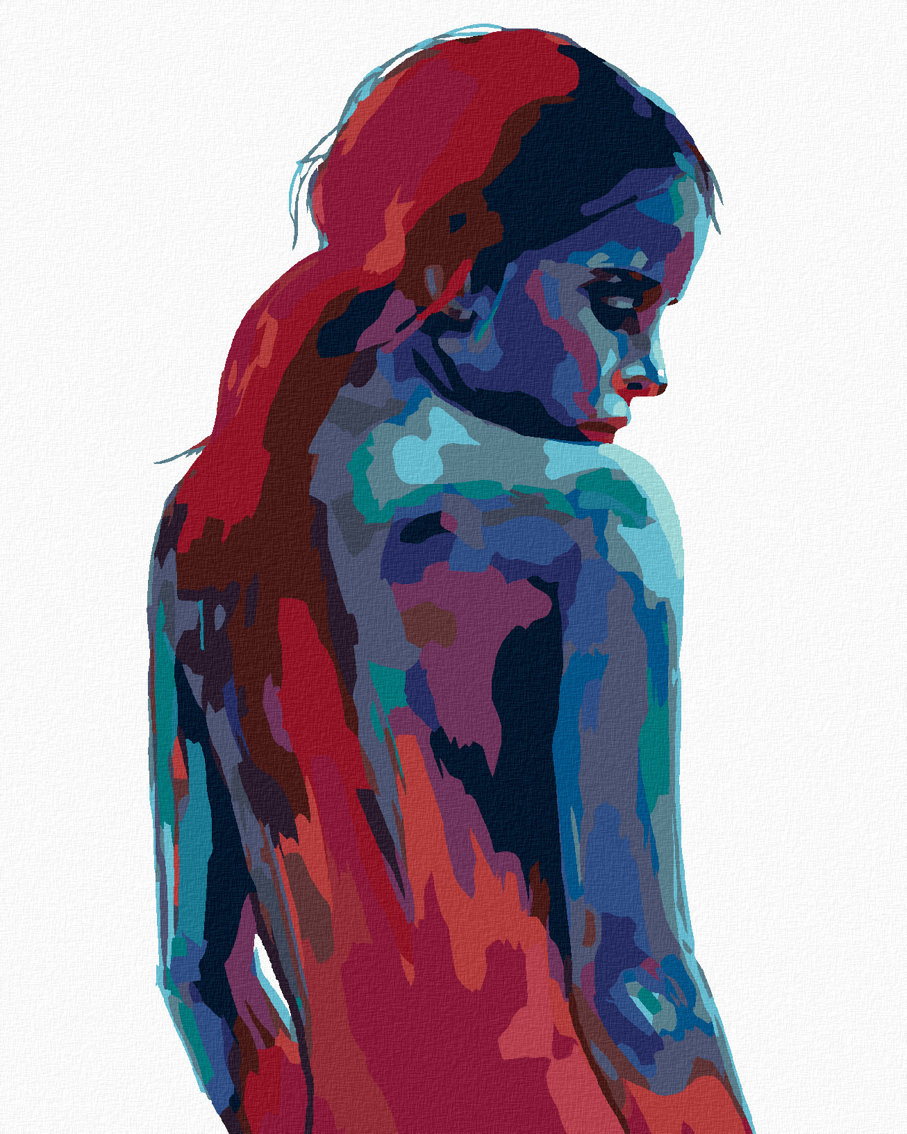 Malování podle čísel - ŽENA V ODSTÍNECH MODRÉ A ČERVENÉ - 80x100 cm, bez rámu a bez vypnutí plátna