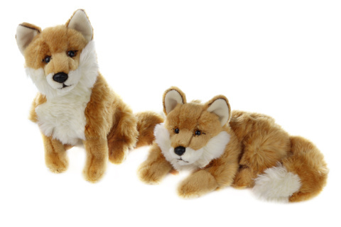 Plyšová liška o velikosti cca 25 x 28 cm (sedící - délka včetně ocasu) a 32 x 15 cm (ležící - délka včetně ocasu). Věk 0+