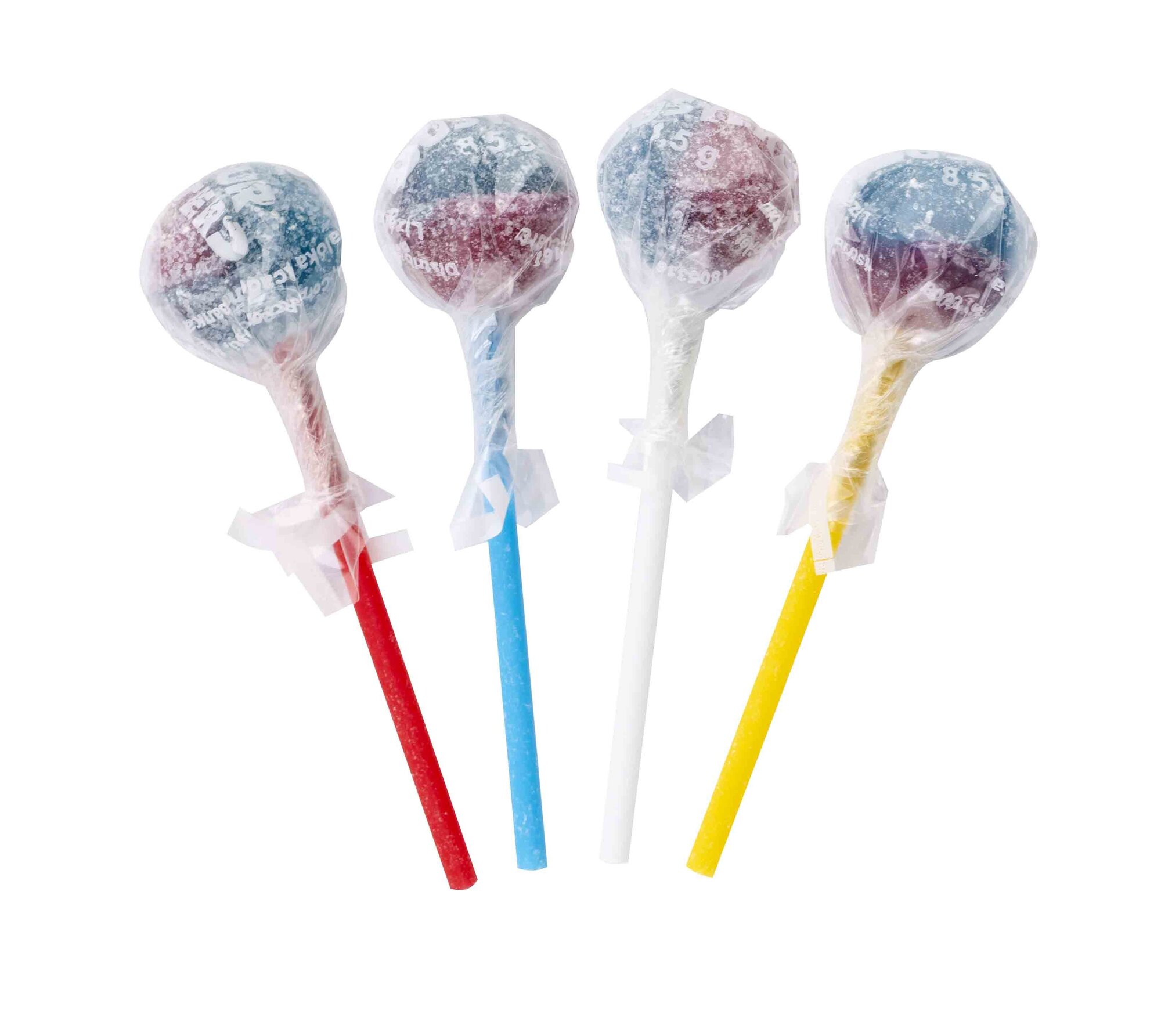 Složení: cukr, glukózový sirup, regulátor kyselosti: E330; aromata, stabilizátor: E471; plně ztužený palmový tuk, barviva: E120, E133, E163. Balení obsahuje 150 ks.