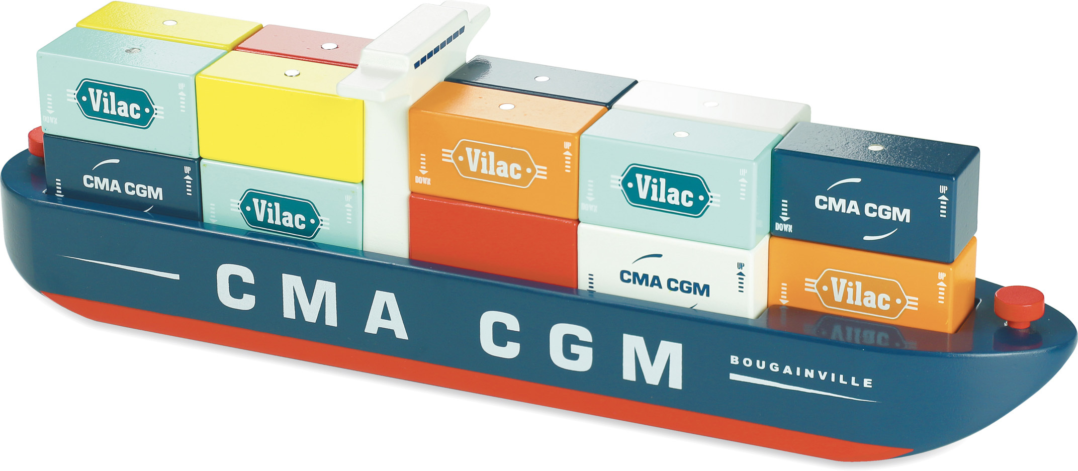 Krásná dřevěná magnetická nákladní loď s 18 kontejnery. Vyrobeno ve spolupráci s CMA CGM. Možno kombinovat s dalšími sety Vilacity. Hračky Vilac mají značku francouzské agentury ADEME, to znamená, že tyto dřevěné hračky jsou vyráběny ekologicky. Šetří životní prostředí, neznečišťují půdu, vodu a vzduch, neplýtvají energiemi. Již více než 100 let plní značka Vilac dětské sny. Společnost Vilac sídlí hluboko v srdci pohoří Jura, obklopena horami, jezery a lesy. Tato francouzská společnost vyrábí od roku 1911 dřevěné hračky v klasickém, starodávném stylu s moderními barvami a vzory. Hračky Vilac jsou jedinečné, nikdy nevyjdou z módy a dokáží okouzlit všechny generace. Vilac pomáhá utvářet dětskou představivost svými radostnými ilustracemi či dizajny a reinterpretací klasických hraček, které se jen tak neopotřebují. Děti dostávají na Vánoce a narozeniny spousty hraček, většina z nich je však nezaujme na dlouhou dobu, láska k hračce se nenaplní. Dřevěné hračky Vilac vzbuzují vášeň i o 50 let později, když jako dospělí náhodou najdete v podkroví hračky, které jste jako děti milovali. Vilac již 100 let propojuje děti s hračkami, které si oblíbí a váží si jich. A proč je děti tak milují? To zůstává tajemstvím firmy Vilac.