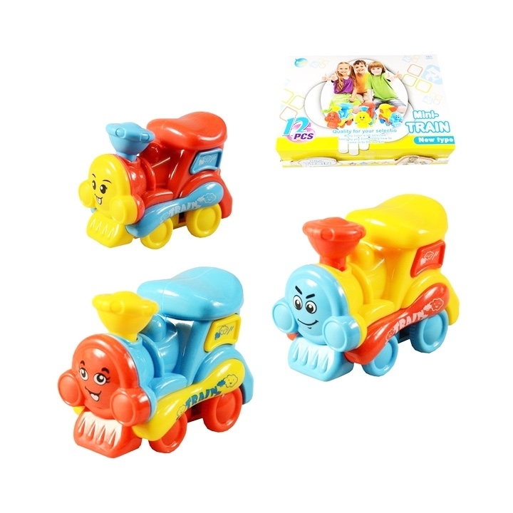 Lokomotiva, na setrvačník, 12 ks v boxuHračka je určena pro děti 3+.Rozměr hračky je 8x6x10cm.Materiál hračky je plast.Balení hračky je display box.