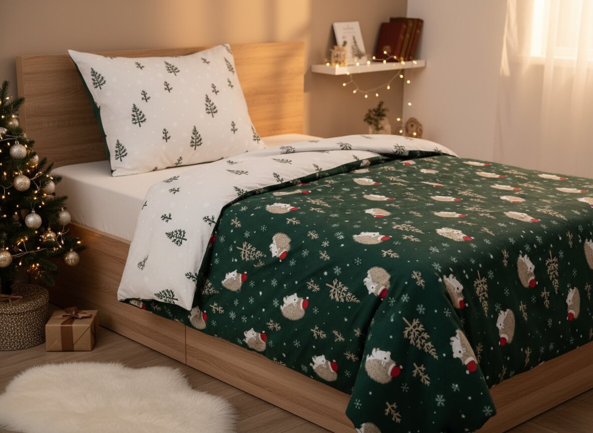 Hledáte ložní prádlo, které kombinuje pohodlí s okouzlujícím svátečním designem? Ložní prádlo ERIZO přesně to splňuje - na jedné straně je zdobeno zeleným motivem s ježky v čepicích Santa Clause a na druhé straně jasným vzorem se stromy a sněhovými vločkami. Díky oboustrannému designu můžete během několika okamžiků změnit charakter svého interiéru a vytvořit zvláštní zimní atmosféru.