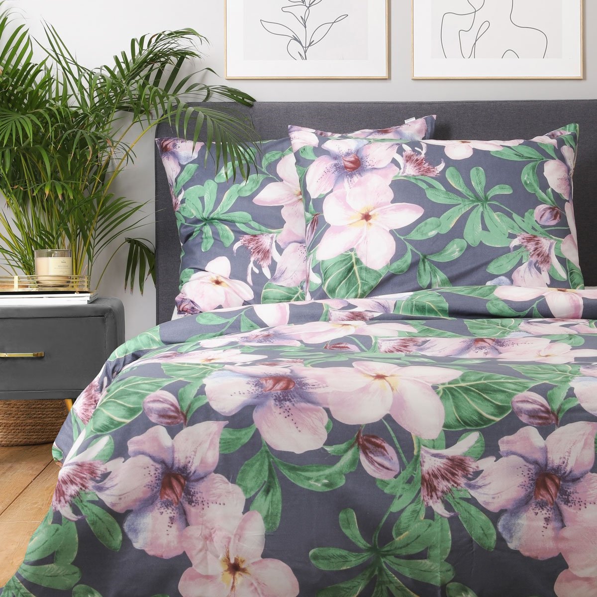 Květinová ložní souprava KOSSA je ideálním produktem pro milovníky květinových motivů a drobných dekorativních prvků obecně. Díky spojení květinového motivu spolu s grafitově šedým odstínem se bude krásně vyjímat mezi aranžemi v eklektickém stylu.