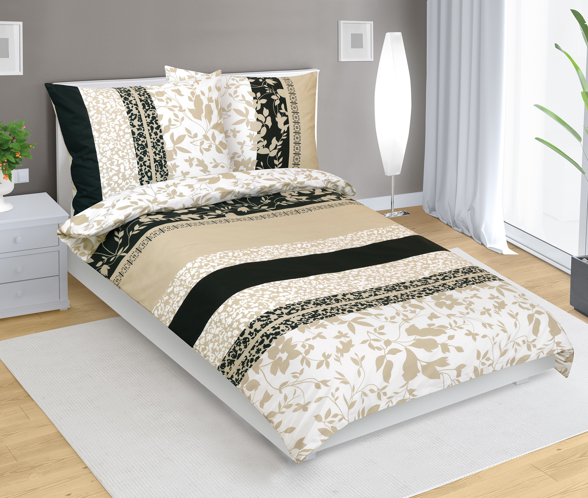 Povlečení bavlněné - Listy béžová, černá - 140x200, 70x90 cm