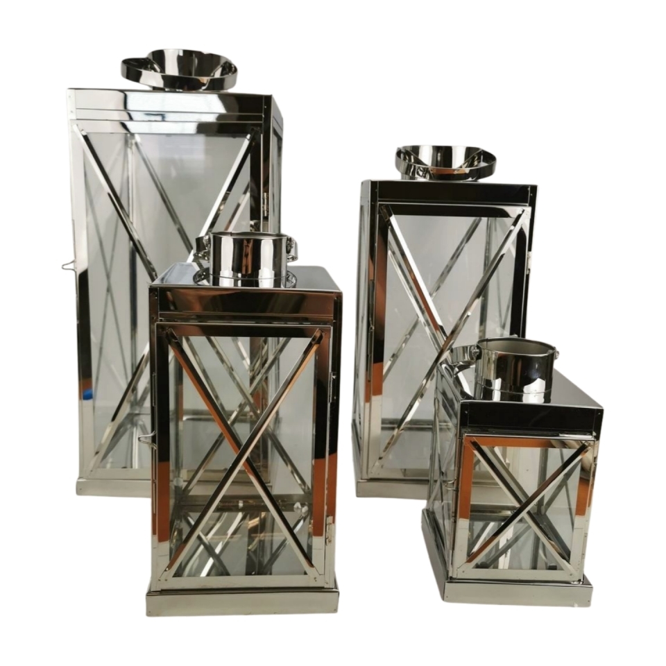 Pozvedněte atmosféru vašeho interiéru pomocí luxusní sady skleněných luceren, které spojují křehkou krásu skla s rafinovaným leskem stříbrného kovu. Sada obsahuje 4ks luceren v různých velikostech.Materiál: kov/sklo