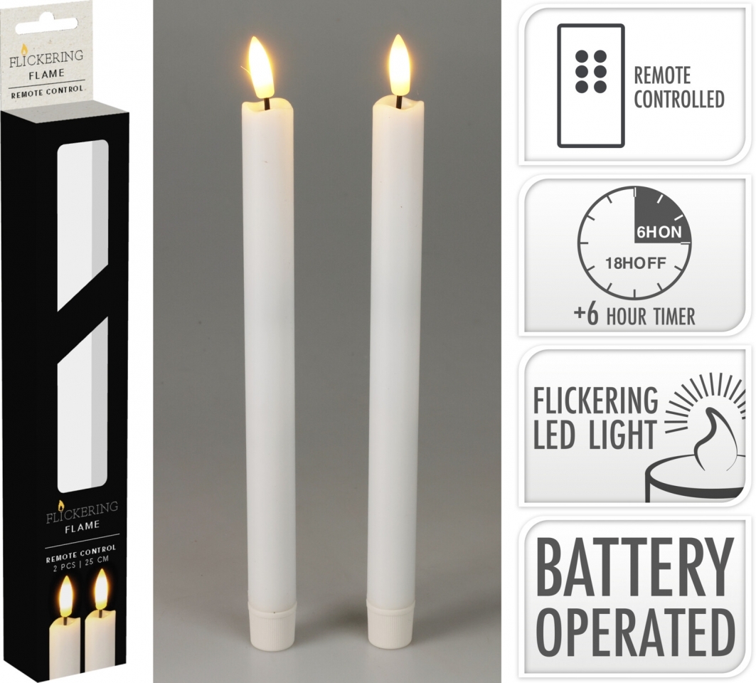 LED svíčky vysoké bílé - sada 2ksmateriál: 20% vosk, 80% ABSbarva: bílározměr: 25 x 2 cm2 x AAA baterie na 1 svíčku - nejsou součástí1X baterie CR2025 je součástí dálkového ovladačdálkový ovladač se 3 tlačítky (ZAP./VYP./ČASOVAČ) číst celé