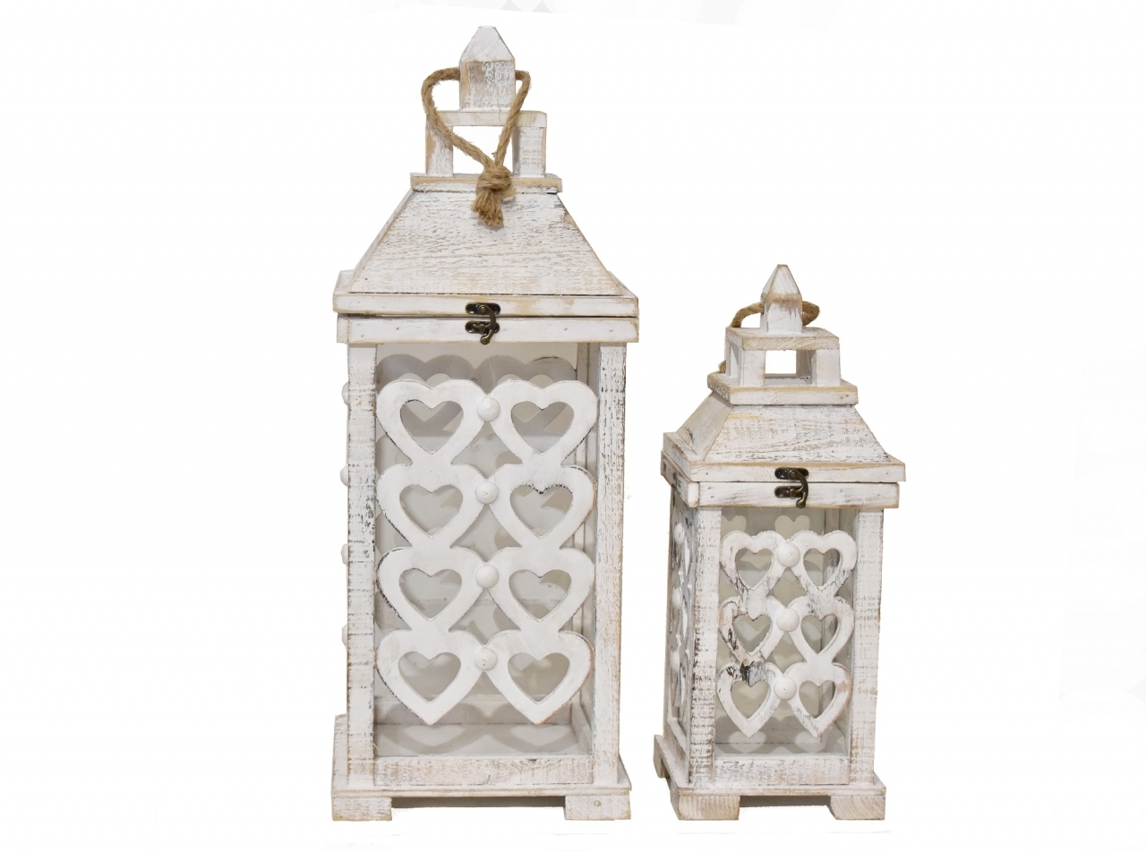 Sada 2 ks dřevěných luceren se srdíčkem. Lucerny se otevírají přes střechu.