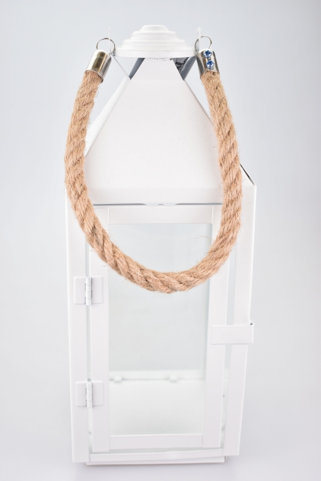 Kovová lucerna s jutovým uchem. Stylová dekorace do interiéru i ven na terasu, zahradu či balkón.