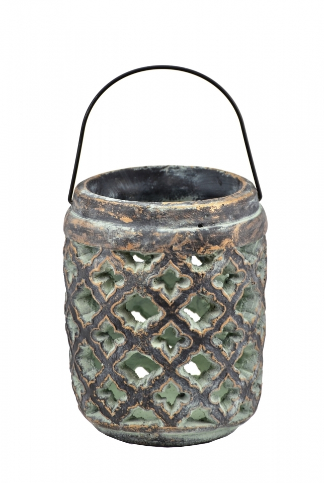 Cementová lucerna s kovovým uchem. Tato dekorace není mrazuvzdorná.