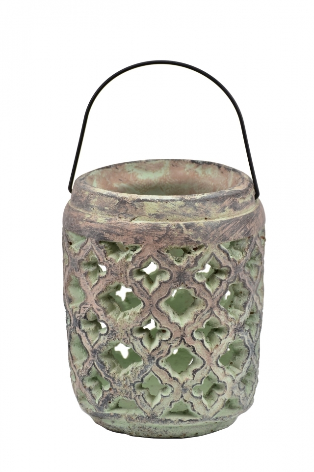 Cementová lucerna s kovovým uchem. Tato dekorace není mrazuvzdorná.