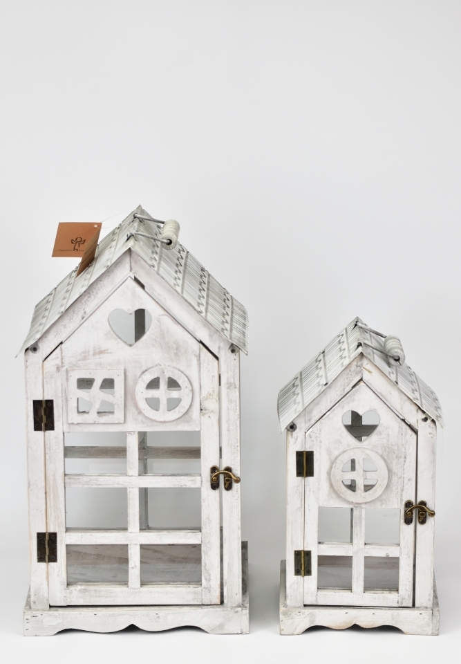 Sada 2 ks dřevěných luceren - domečků s kovovou střechou.