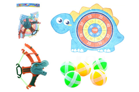 Terč na suchý zip s motivem dina. Balení obsahuje terč, 5 míčků, kuši a háček k zavěšení. Baleno v igelitovém sáčku. Rozměry terče cca 42x28 cm. Velikost míčku 3,5 cm. Rozměry balení cca 31x42x8 cm. Věk 3+