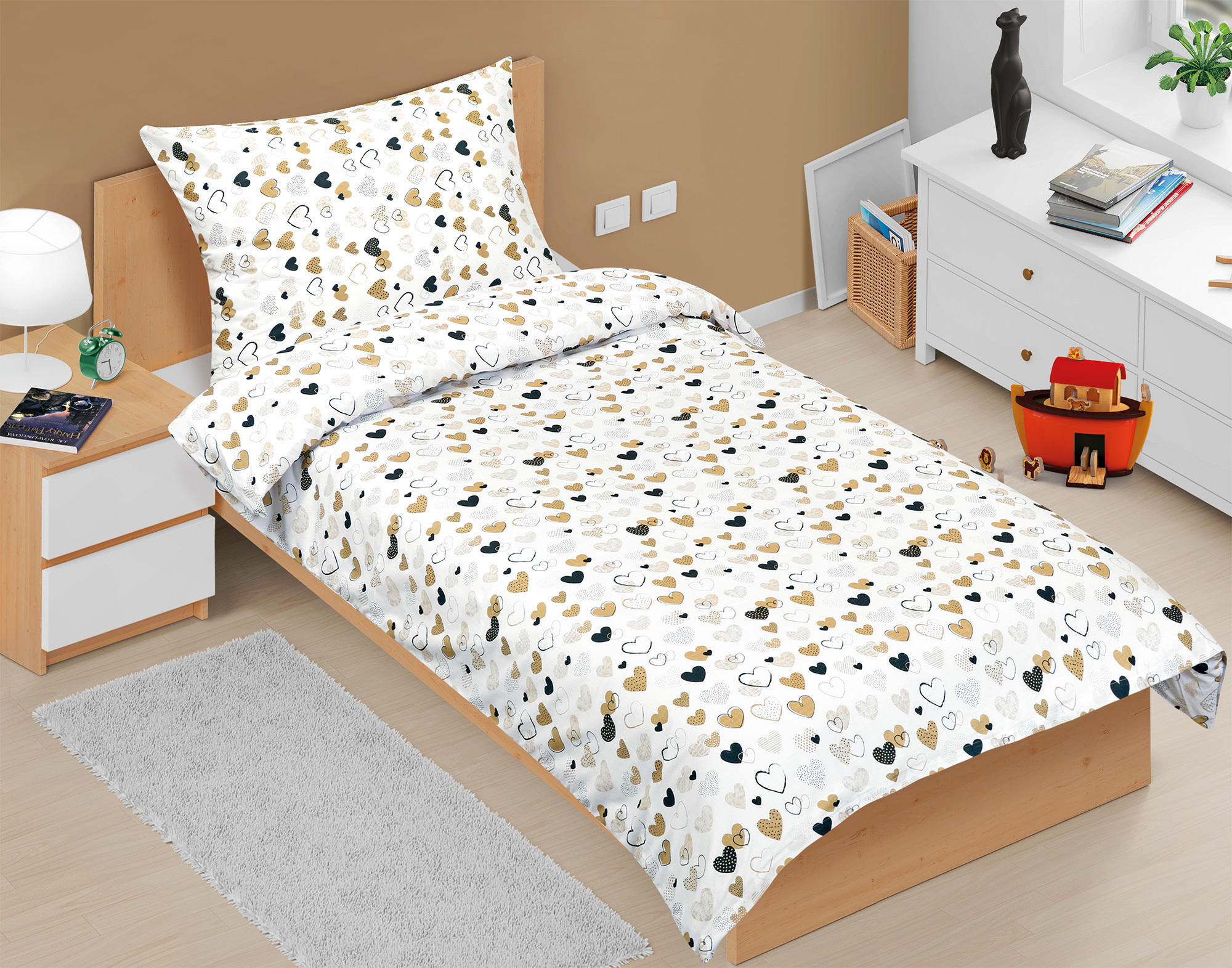 Povlečení bavlněné Junior - srdce - hořčicová, černá - 140x200, 70x90 cm