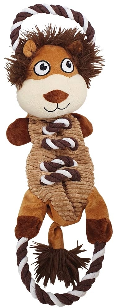 Hračka pro psy ke kousání a zábavu. Lev v hnědé barvě a celkovým rozměrem 47 cm. Hračka je ideální pro psy, kteří chtějí hrát a mazlit se. Je ideální k mazlení a lano je určené k tahání a hraní. Hračka disponuje silným lanem, čímž pes při kousání tuto hračku rychle nezničí. Hračka obsahuje pískátko. Celková velikost: 47 cm Materiál: kvalitní plyš, lano Upozornění: Stejně jako u jiných hraček pro psy by si i s touto hračkou mělo zvíře hrát pod dohledem páníčka nebo jiné zodpovědné osoby. Prosíme dbejte na to, aby hračka, s kterou si Váš pes hraje, byla nepoškozená. Stav hračky pravidelně kontrolujte. V případě, že je hračka poškozena nebo jí již chybí některé součásti, tuto hračku prosím nahraďte. Zamezíte tak případnému zranění Vašeho psa