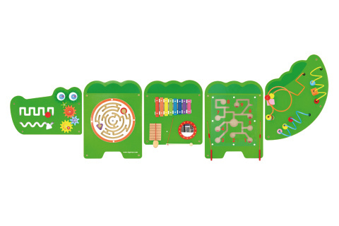 Dřevěná nástěnná hra krokodýl. Velikost cca 190 x 59 cm. Hra obsahuje xylofon, magnetický labyrint, labyrint s korálky a mnoho dalších her. Rozměry balení cca 37,5 x 49 x 30 cm. Věk 18m+