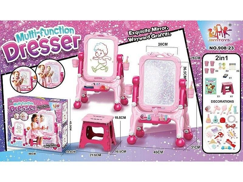toaletka z wysposażeniem i obrotowym lustrem, tablicą-znikopisem i koszykówką, krzesełko, wym.rozłożonej toaletki 76x45x31cm; 48x43x14,5cm, Box číst celé