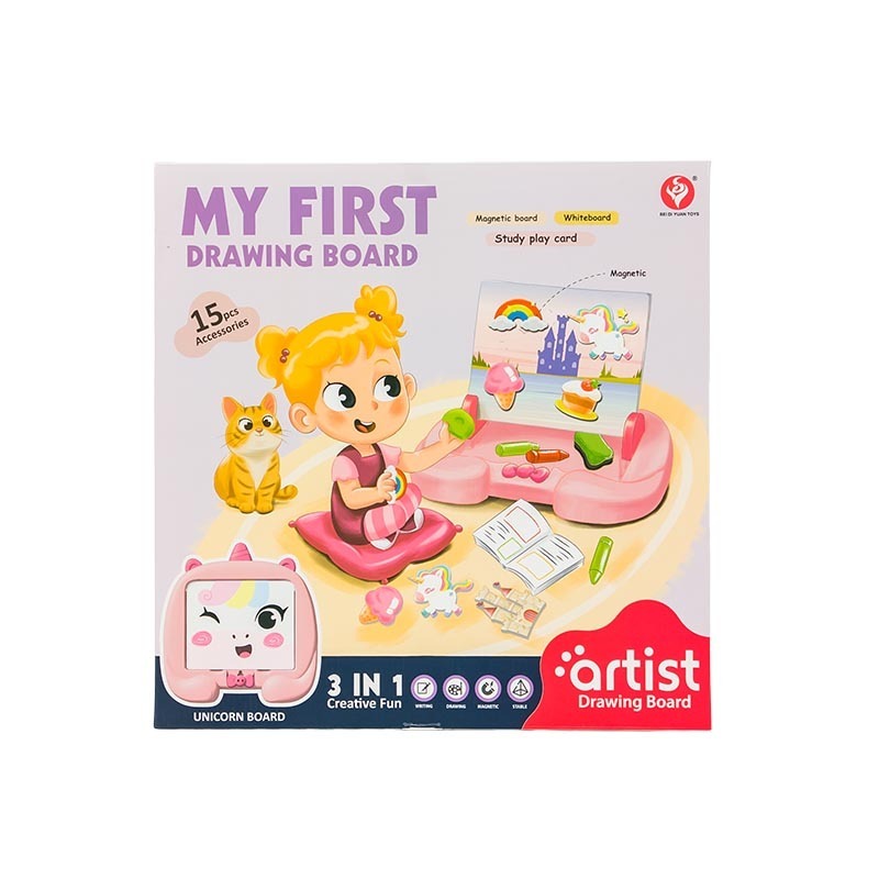 Tablica magnetyczna z akcesoriami to niezwykle kreatywny zestaw, łączący w sobie elementy świetnej zabawy z wartościami edukacyjnymi. Głównym elementem zestawu jest duża tablica o właściwościach magnetycznych, po której dzieci mogą zarówno rysować za pomocą specjalnego markera z końcówką ścierającą, jak i samodzielnie tworzyć na niej różne słowa, działania matematyczne lub scenki z magicznej krainy, wykorzystując w tym celu arkusze z magnesami. Dodatkowo do zestawu dołączono również pięć kart przedstawiających różne przedmioty, jakie mogą istnieć w magicznej krainie oraz ich nazwy w języku angielskim. Tablicą magnetyczną można bawić się na płasko lub ustawić ją pionowo za pomocą uchwytów. Zabawka pozytywnie wpływa na prawidłowy rozwój dziecka przez doskonalenie zdolności manualnych, umiejętności logicznego myślenia, koordynacji ręka-oko, a także pobudza wyobraźnię i zachęca do kreatywności. Zawartość opakowania: - 1 x tablica magnetyczna, - 3 x arkusz z magnesami, - 1 x marker z końcówką ścierającą, - 5 x kart z ilustracjami i ich nazwami. Wymiary opakowania: 30,5x30,5x4,5cm Wiek: 3+