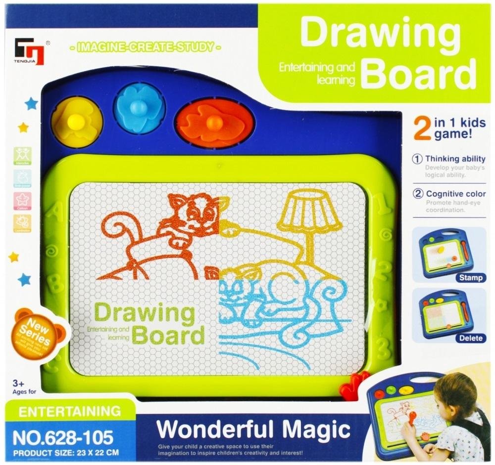 Zalety produktu: w zależności w której jego części powstanie rysunek, będzie on w jednym z czterech kolorów. Kolorowy Znikopis to najlepszy pomysł na naukę rysowania Twojego dziecka. Nie musisz się przejmować czy linia będzie prosta czy krzywa, jeżeli coś nie wyjdzie, łatwo zmażesz to jednym ruchem. Ten Znikopis posiada specjalną powłokę! Znikopis MEGA CREATIVE z akcesoriami to być może powierzchnia, na której powstanie pierwsze dzieło sztuki Twojej pociechy! Zawartość zestawu: znikopis magnetyczny, długopis oraz 3 pieczątki. Wymiary/waga/baterie: wymiary produktu (dł. x wys. x gł.) [cm]: 23x22x3, wymiary opakowania (dł. x wys. x gł.) [cm]: 24x23x3, waga produktu bez opakowania [kg]: 0,38 kg, waga produktu w opakowaniu [kg]: 0,56 kg, nie wymaga zasilania bateriami. Zabawka przeznaczona dla dzieci w wieku: 3+.Pakowana w kartonik z okienkiem.