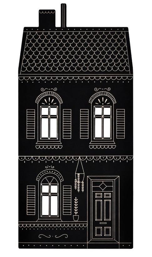 Kamieniczka z jednej strony jest pokryta farbą tablicową i posiada wygrawerowane elementy, z drugiej natomiast jest biała.