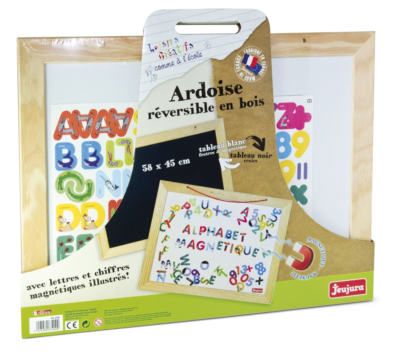 Tabule je z jedné strany magnetická. Součástí balení je magnetická abeceda s čísly. Francouzská značka Jeujura se specializuje na výrobu dřevěných domečků a švýcarských chat, vyrábí ale také dětské tabule a další dřevěné hračky. Jeujura vyrábí své hračky ze dřeva z místních lesů (Jura kurz).