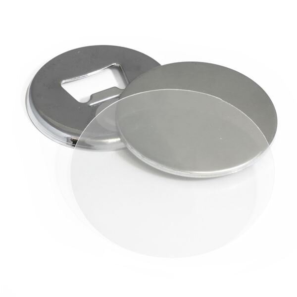 sada komponentů pro výrobu otvíráku s magnetem ;obsahuje horní díl, spodní díl otvírák s magnetem, krycí fólii ;průměr placky 58 mm ;materiál: kov ;barva: kovová stříbrná ;spotřební materiál pro 50 kusů placek s otvírákem ;magnet je dostatečně silný a vhodný na lednici či jiné kovové...