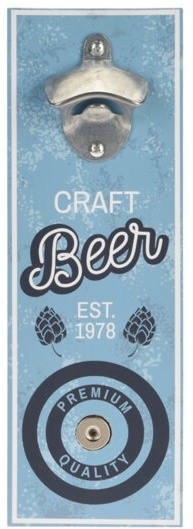 Otvírák lahví s papírovým potiskem. Otvírák má na zadní straně háček k zavěšení na zeď.
