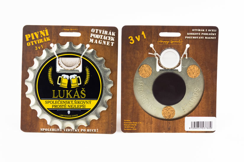 Otvírák ve tvaru velké pivní zátky je dobrou volbou pro všechny milovníky nejtradičnějšího českého nápoje. Navíc překvapí i dalšími možnostmi. Využijte jako podtácek, připněte na ledničku díky magnetu. Potěšte mužské ego lichotivými nápisy.Díky širokému výběru nejčetnějších mužských jmen a obecných rodinných názvů snadno najdete ten nejvhodnější pro vás.