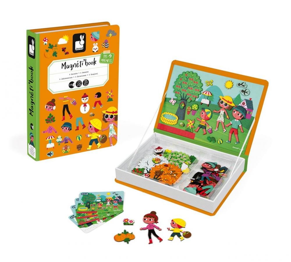 Magnetická kniha Magneti'Book Four Seasons od značky Janod nabízí dětem od 3 do 8 let možnost skládat barevné obrázky ročních období pomocí magnetických dílků. Děti si mohou podle předloh sestavit scénu jednotlivých ročních období včetně vhodného oblečení a doplňků, což jim pomáhá lépe pochopit změny počasí a učí je rozpoznávat charakteristické znaky jara, léta, podzimu a zimy. Díky praktickému balení v podobě knihy je hračka snadno přenosná, což umožňuje zábavu i na cestách.