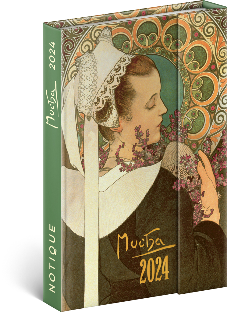 Šestijazyčný týdenní diář s magnetickým uzavíráním obsahuje přehled mezinárodních svátků, seznam českých a slovenských jmen, přehled roku 2024 a 2025, adresář a kapsičku na zadní předsádce. Sloupcové rozvržení s prostorem pro poznámky na každý den. Diář doplňují obrazy oblíbeného secesního malíře Alfonse Muchy. Západní verze obsahuje kalendárium s jazyky EN, DE, ES, FR, IT, NL.