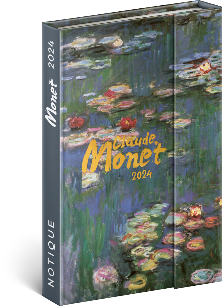 Šestijazyčný týdenní diář s magnetickým uzavíráním obsahuje přehled mezinárodních svátků, seznam českých a slovenských jmen, přehled roku 2024 a 2025, adresář a kapsičku na zadní předsádce. Sloupcové rozvržení s prostorem pro poznámky na každý den. Diář doplňují obrazy malíře Clauda Moneta.